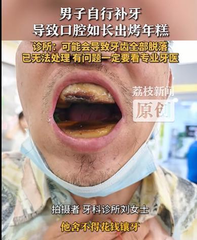 近日,天津一男子自行补牙,导致口腔如长出烤年糕。拍摄者牙科诊所刘女士告诉荔枝新闻记者:自己是开牙科诊所的,当时大叔过来求医,他的牙齿在那里边包裹着,外面是树脂。他舍不得花钱镶牙,材料是在网上花5块钱买的,这个情况没人敢拆,可能会导致牙齿全部脱落。